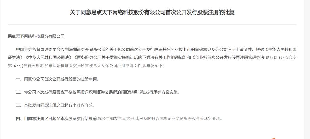 2022年7月6日,中國證券監督管理委員會(huì )公告發(fā)出《關(guān)于同意易點(diǎn)天下網(wǎng)絡(luò )科技股份有限公司首次公開(kāi)發(fā)行股票注冊的批復》,同意易點(diǎn)天下網(wǎng)絡(luò )科技股份有限公司首次公開(kāi)發(fā)行股票的注冊申請。