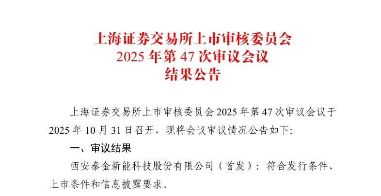 2025年10月31日,西安泰金新能科技股份有限公司(以下簡(jiǎn)稱(chēng)“泰金新能”)科創(chuàng )板IPO項目獲得上市委審議通過(guò)。