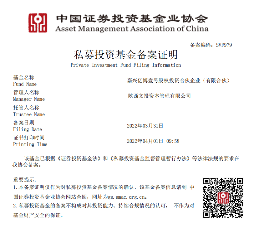 2022年3月31日,陜西文投資本管理有限公司(以下簡(jiǎn)稱(chēng)“陜文投資本”)設立并擔任管理人的嘉興億博壹號股權投資合伙企業(yè)(有限合伙)(以下簡(jiǎn)稱(chēng)“億博壹號基金”)在中國證券投資基金業(yè)協(xié)會(huì )完成備案。億博壹號基金...